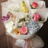 В центре композиции — пышная небесно-голубая гортензия, которая задает тон всему букету. Ее дополняют классические и пионовидные розовые розы, символизирующие нежность, и яркая оранжевая гербера, привносящая солнечную энергию. Высокие соцветия желтого маттиолы добавляют букету динамики и объема, а фиолетовые акценты альстромерии и белоснежные хризантемы создают необходимый контраст. Особое очарование и легкость придают мелкие ромашки, которые делают букет похожим на охапку цветов, только что собранных в сказочном саду.